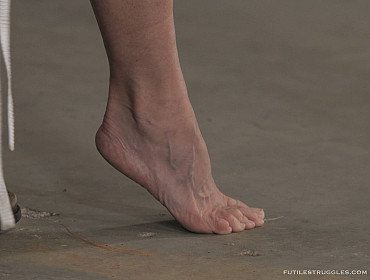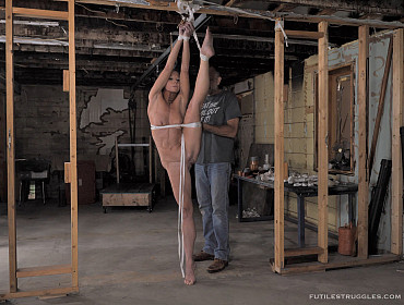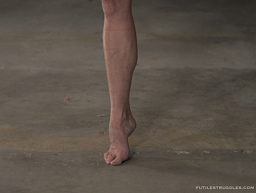 Portia stands with arms bound above. I grope and manhandle her for a short while, before tying her left ankle to the same hardpoint as her wrists. Another rope cinches her thigh to her chest. I gag her with rope as well, before stepping back to enjoy the show. This is where Episode 1 ends.