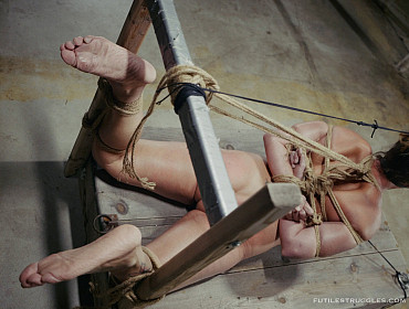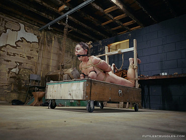 This Episode starts where Episode 8 ended. Carissa is hogtied utilizing the cart. I nose hook her and tie her tits to the front corner of the cart. I then pull her hogtie arch a bit tighter, which of course gives her tits extra tension as well.