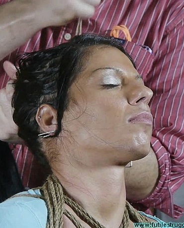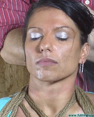This clip starts where Part 1 ended... A crotchrope is added next. I pull up a chair and order Alexis to take a seat. I remove her neckrope and I tie a length of twine into her hair. I am soon stuffing 2 pairs of panties in her mouth. They are sealed in with clear tape. Once gagged, I put Alexis on her stomach on the floor. I grope and smack her ass a few times before I cross and tie her ankles. I grope and smack her ass again. I then sit back and order her to struggle. Let's see if she can escape. Of course she can't the jute rope has no give at all and Alexis makes zero progress. She still has to much movement for my liking, so I tie her ankles down to her thighs. This is where Part 2 ends.