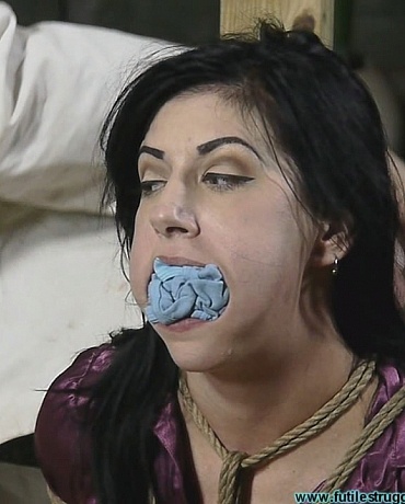 This clip starts where Part 1 ended... Nyxon is cleave gagged tightly with an ace bandage. Black tape is then added to make it tighter. You can tell that this is a severe gag by the way Nyxon is moaning. He continues tying Nyxon. After a while he removes that gag and gives her a quick break as he finishes tying up some loose ends. He soon produces 2 pairs of panties. He tries to stuff them both in her mouth, but soon realizes that even if they do fit, he won't get the kind of gag necessary for the treatment. He instead stuffs her mouth with just the blue pair and then seals them in tight with black tape. Nyxon is soon moved to the floor and balltied. She remains there for the rest of the clip not being able to move at all. At the end of the clip the Dr. removes the gag.