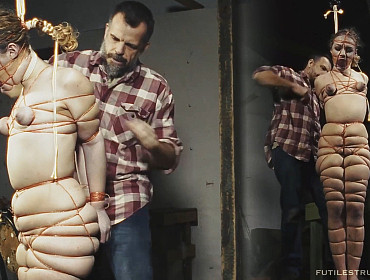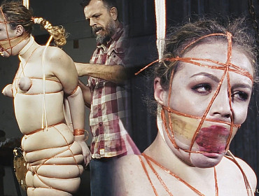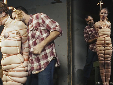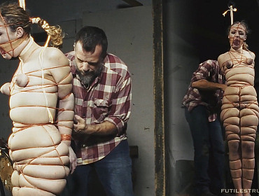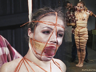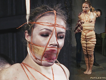 This Episode starts where Episode 3 ended. After I finish tying up the loose ends of her face bondage, I stand her back up, so I can get her arms bound in a similar fashion, as her legs. This is where Episode 4 ends.