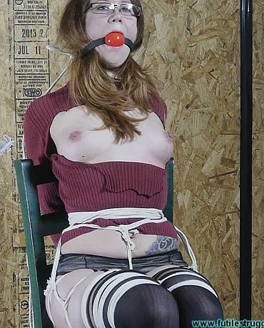 This clip starts where Part 1 ended. With Penny now seated I stand behind her and slap grope her tits... readying them for some bondage. I remove her gag and her neckrope and then I grab her by her hair with one hand and continue slap groping her tits with my other hand. I think they're about ready to be tied. I gag Penny tightly with and Ace bandage and then I bind up her tits nice and tight. I take a few moments to slap flick her freshly bound tits before I start adding more rope. Soon I have her upper bound and her arms in a reverse prayer. I have another gag in mind before I hogtie her, so I remove her cleave gag. This is where Part 2 ends.