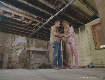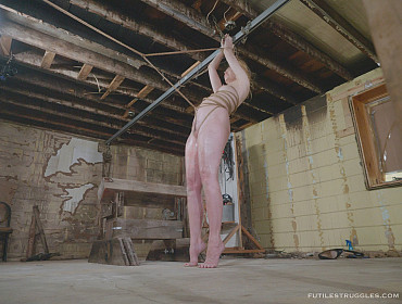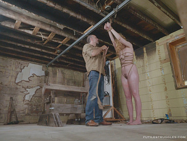 This Episode starts where Episode 10 ended. After enduring the tight crotchrope for a while longer, I release her, but only to bind her arms behind her back in a strict elbows together position. She is then immediately placed on the wooden horse, where a spreader bar is affixed to her ankles. This is where Episode 11 ends.
