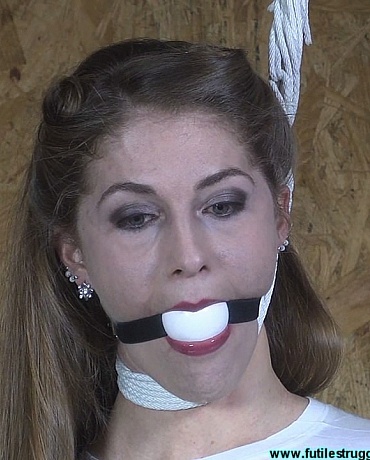 Terra wants to be a FutileStruggles model. I'm hesitant at first because she doesn't do any on camera nudity, but She's very attractive and flexible. After meeting her I decide to give her a try. The first thing I do is gag her. A white ballgag is strapped in as tight as it will go. The strap could use a few more holes in my opinion, but it's still pretty tight. I manhandle her and use her tit as a handle. I can turn her anyway I want. I turn her around and smack her, disco jean shorts clad, ass multiple times. A crotchrope and a few well placed other ropes are added, before I turn her around again. I smack and grope her ass again. After a while, I get out more rope, and add a good 6 or 7 bands of cinched rope to her legs. Terra yelps and moans as I smack her ass once again. At the end of Part 1, I untie her neckrope and sit her down in a chair.